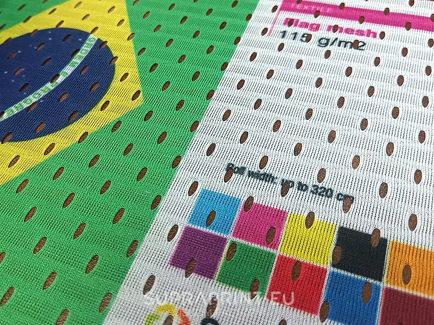 Le tissu polyester 115g/m2 est le matériau le plus populaire pour la production de drapeaux et de bannières textiles fines. Le drapeau est partiellement transparent et 80 % de l’impression est visible de l’autre côté du tissu.