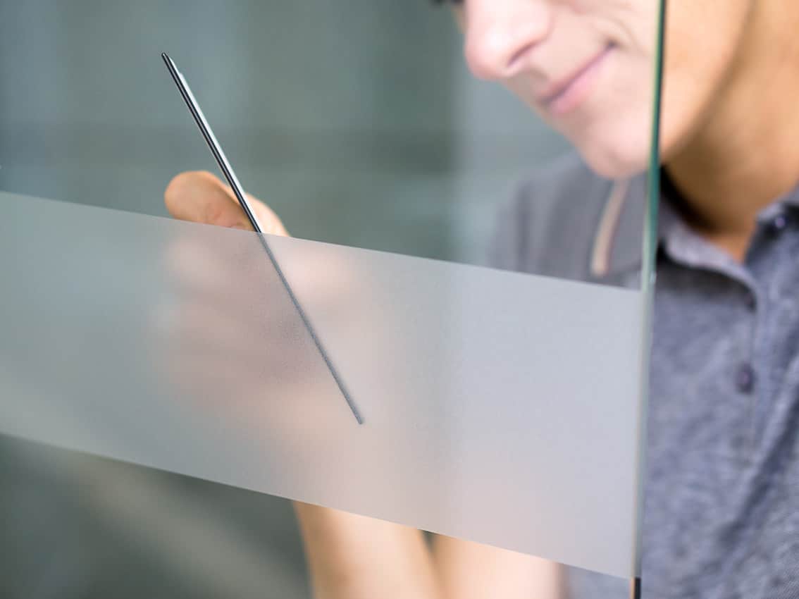 Feuille décorative dépoli tracée imitant l’effet du verre gelé. Dédié aux applications sur les vitrines et les vitrages des bureaux. La structure laiteuse du film transmet partiellement et en même temps diffuse la lumière.
